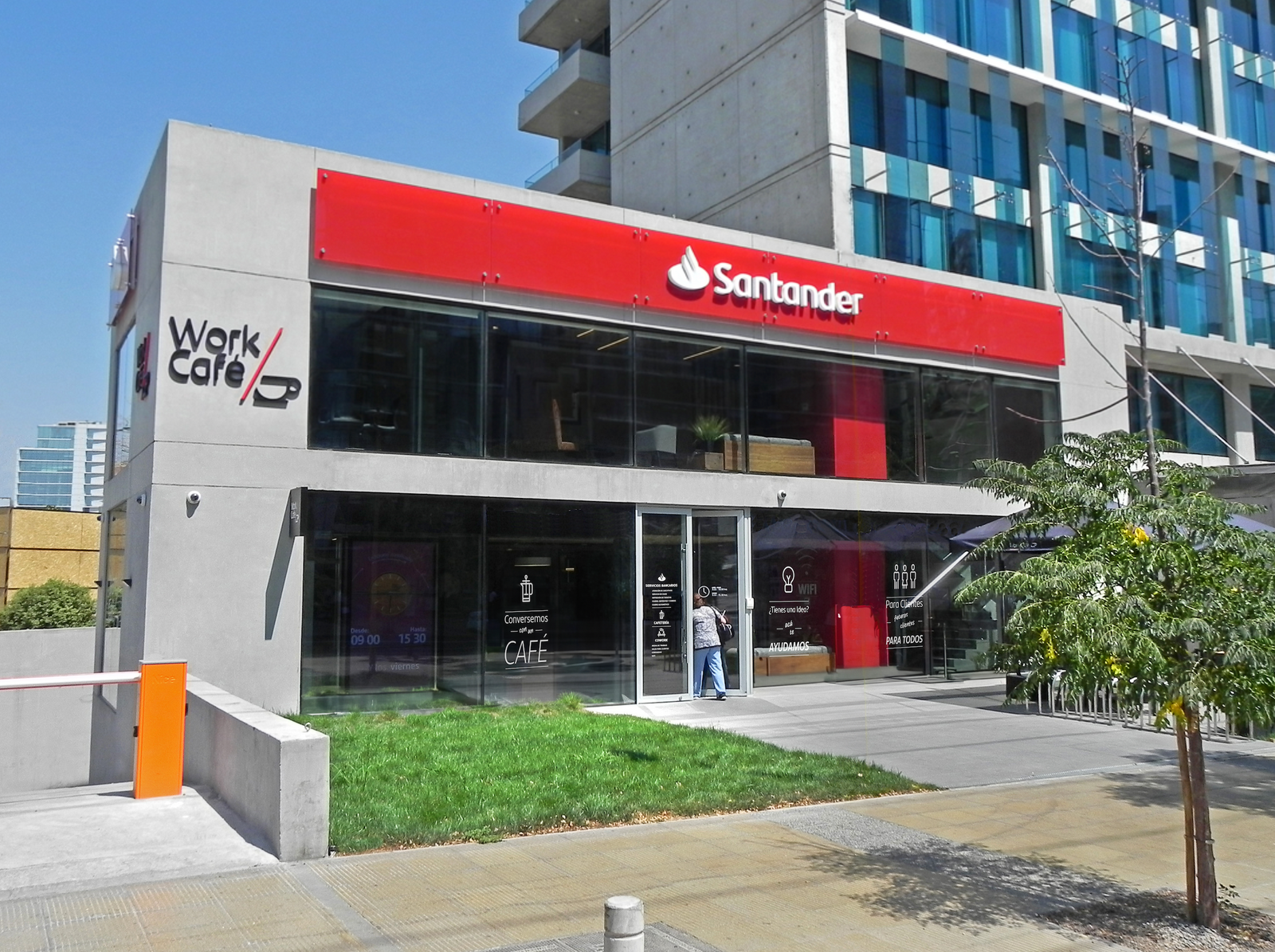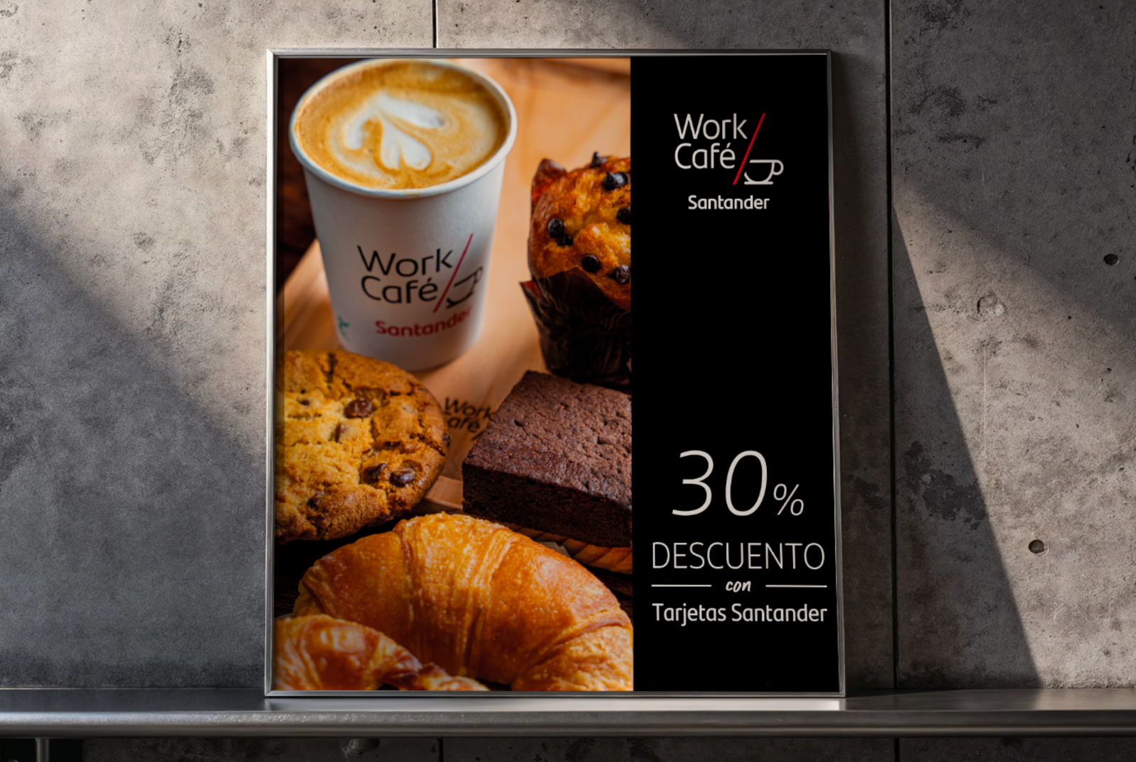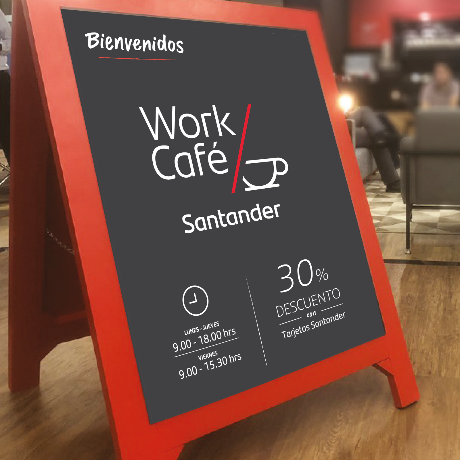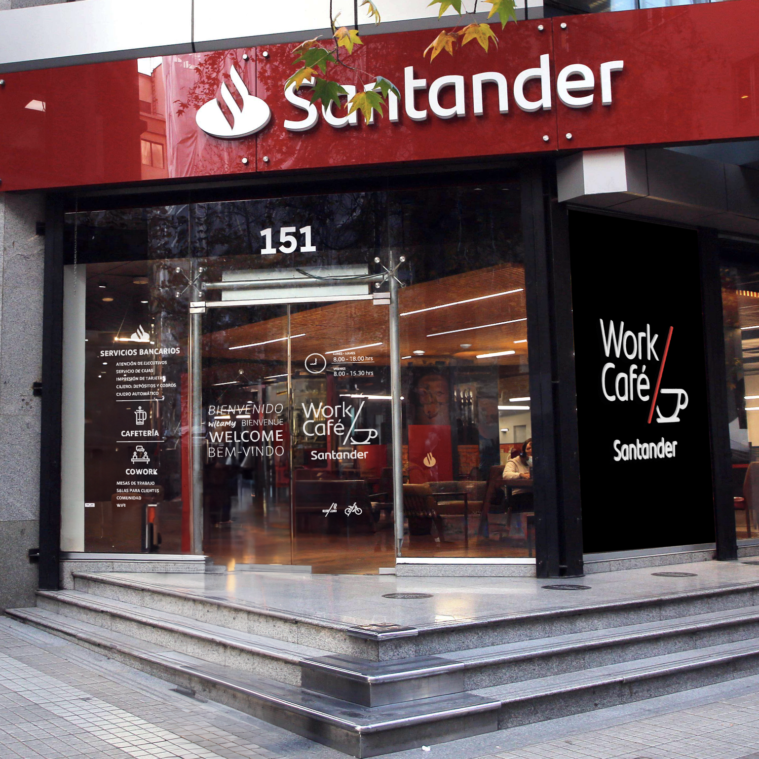 Desarrollo de concepto, piezas y dirección visual para unas aproximadamente 70 sucursales Santander Work/Café en Chile.