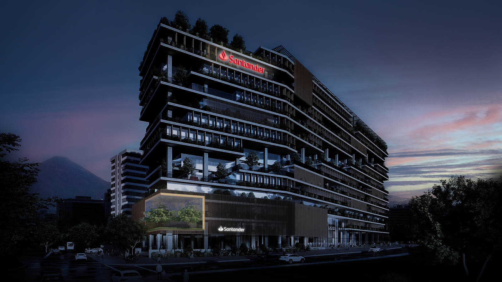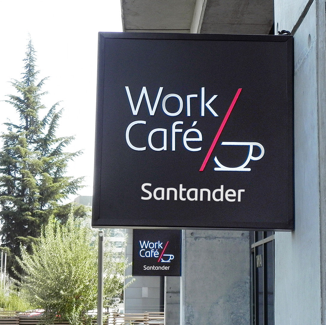Se desarrollaron propuestas de corpóreos para Santander y Work/Café destinadas a las cuatro fachadas del nuevo edificio corporativo en Chile. Adicionalmente, se propusieron ajustes menores en la arquitectura de fachada con el objetivo de mejorar la visibilidad, legibilidad y correcta jerarquía de ambas marcas.
